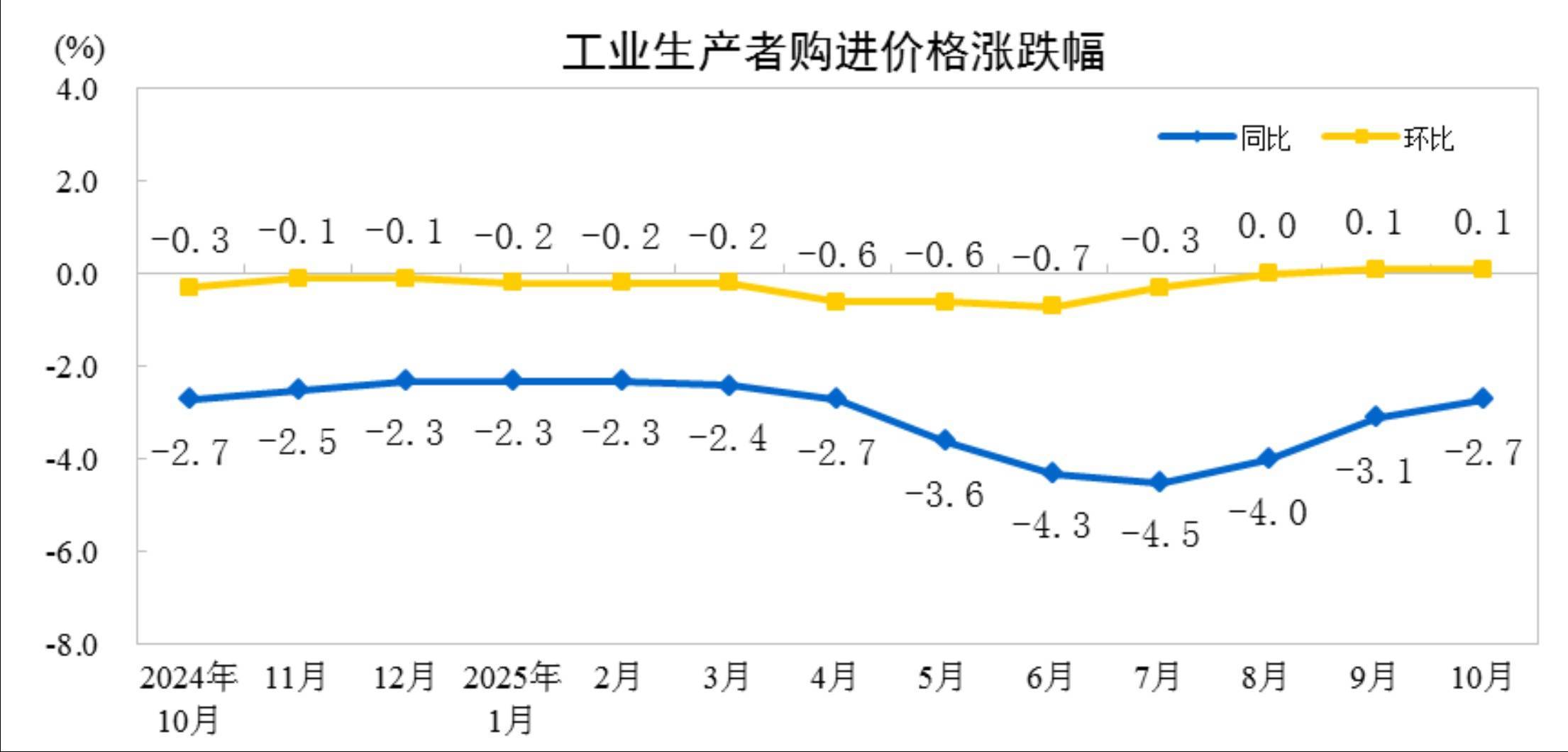 2025年10月份,全国工业生产者出厂价格同比下降2.1%,降幅比上月收窄0.2个百分点;环比由上月持平转为上涨0.1%。工业生产者购进价格同比下降2.7%,降幅比上月收窄0.4个百分点;环比上涨0.1%,涨幅与上月相同。1—10月平均,工业生产者出厂价格比上年同期下降2.7%,工业生产者购进价格下降3.2%。