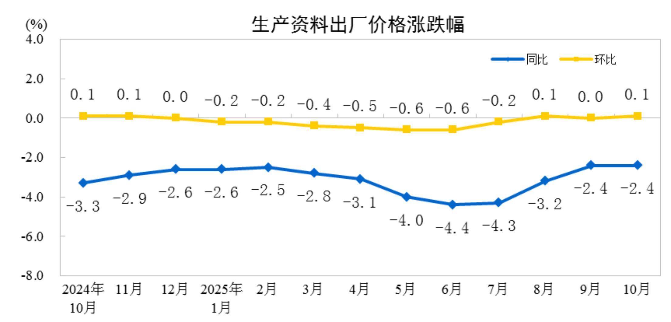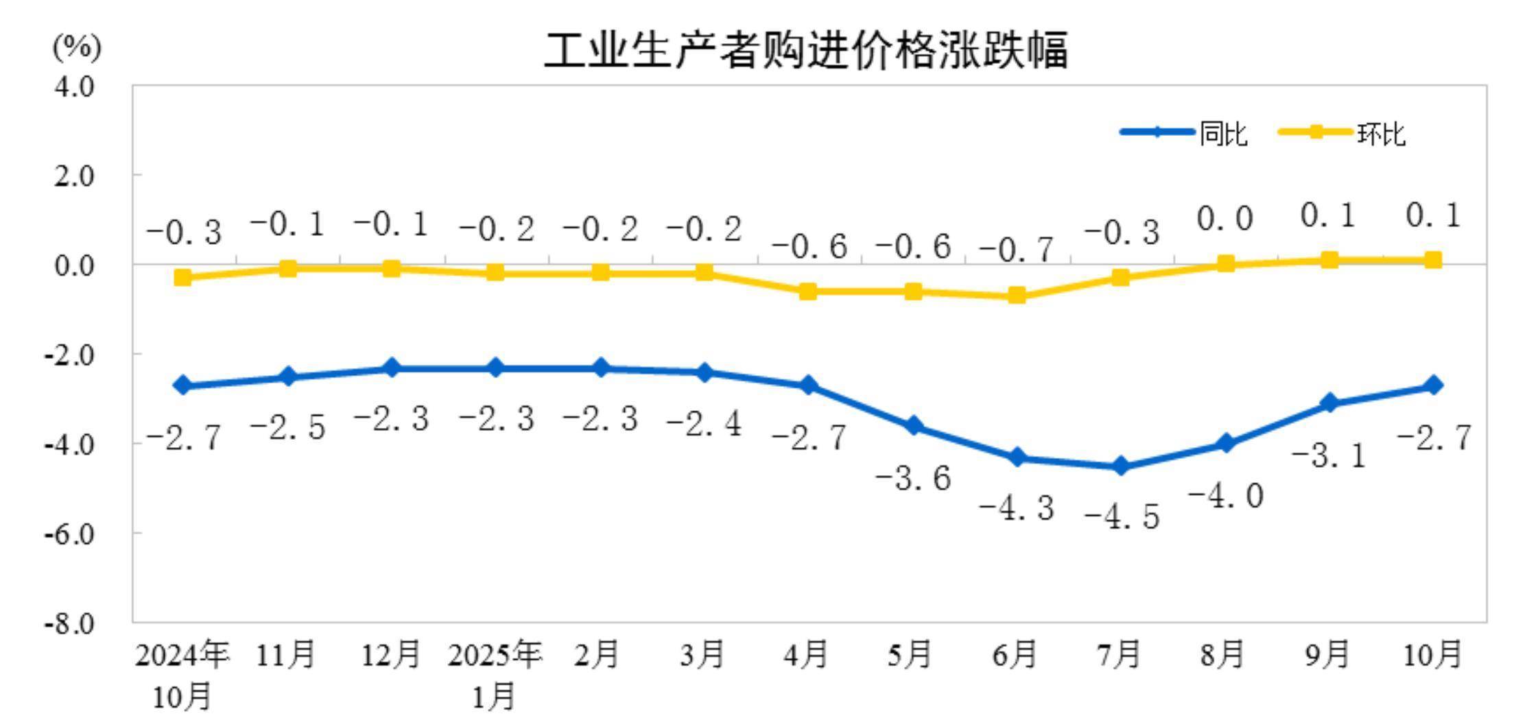国家统计局11月9日公布数据显示,10月份,全国工业生产者出厂价格同比下降2.1%,降幅比上月收窄0.2个百分点;环比由上月持平转为上涨0.1%。工业生产者购进价格同比下降2.7%,降幅比上月收窄0.4个百分点;环比上涨0.1%,涨幅与上月相同。1—10月平均,工业生产者出厂价格比上年同期下降2.7%,工业生产者购进价格下降3.2%。