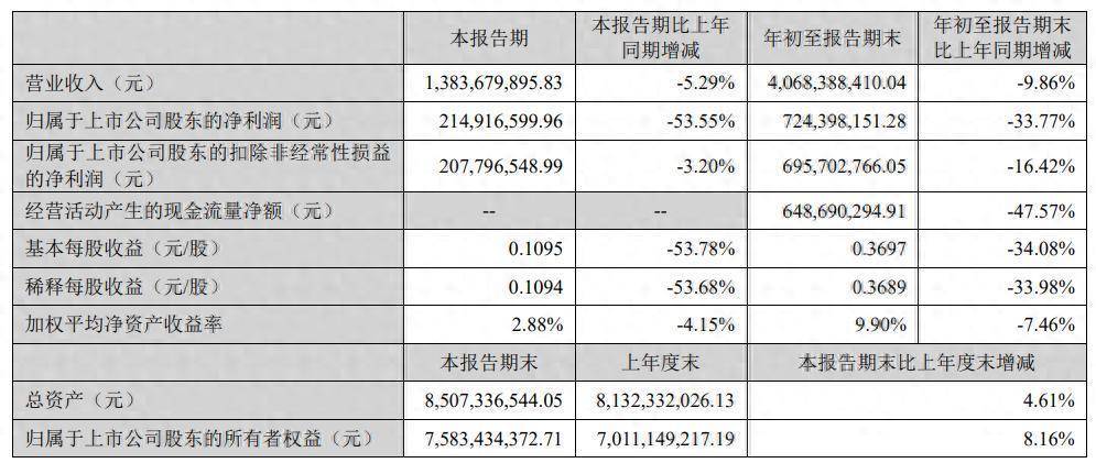 第三季度,公司营业收入为13.84亿元,同比下降5.29%;归母净利润为2.15亿元,同比下降53.55%;扣非归母净利润为2.08亿元,同比下降3.20%。
